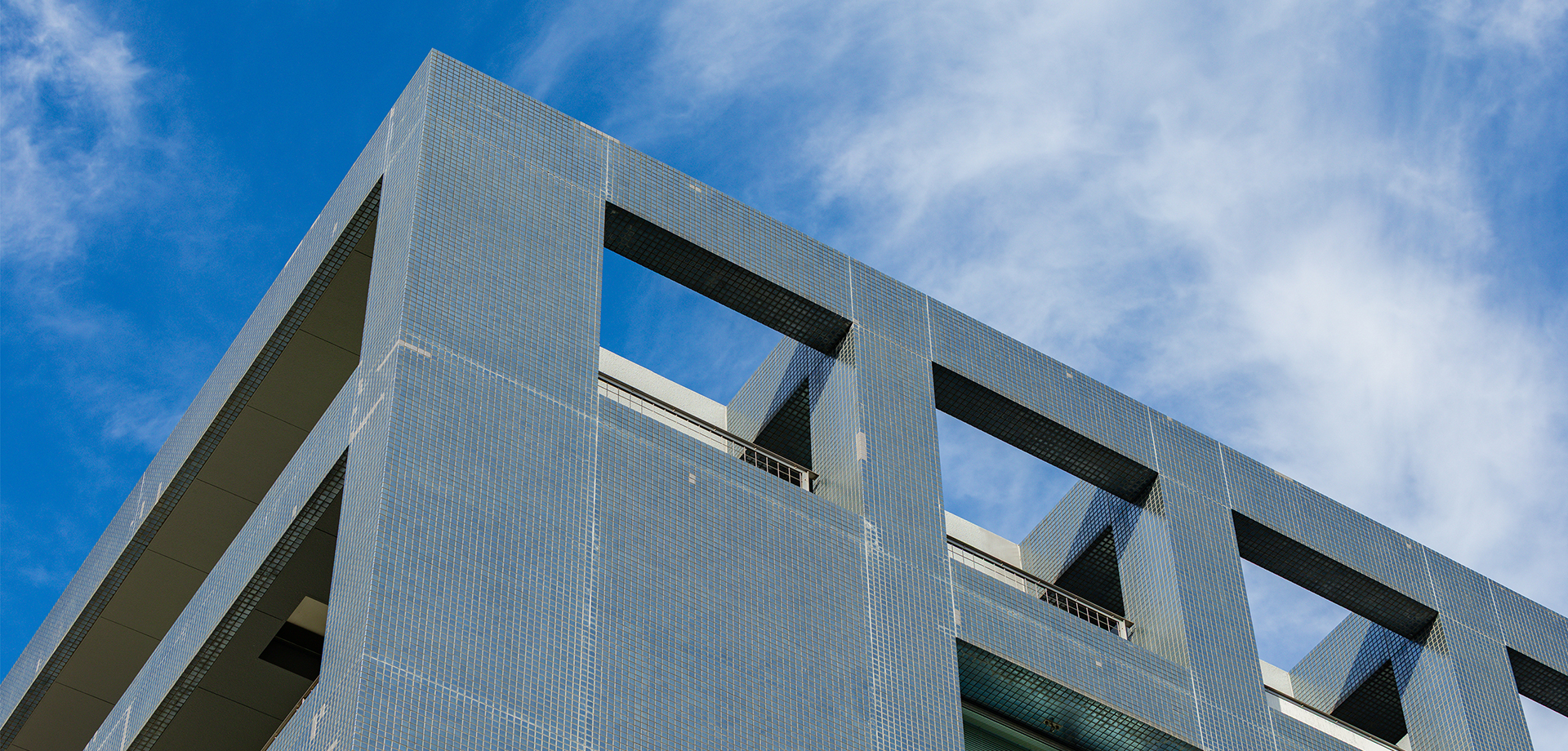 東京メトロ「九段下」駅から徒歩4分、閑静な文教施設エリアにある青を基調とした落ち着いた外観。