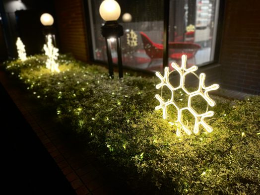 温かみのあるシャンパンゴールドの光がT-Placeを上品に照らし、ネオンカラーで輝く雪の結晶が冬の訪れを感じさせます。