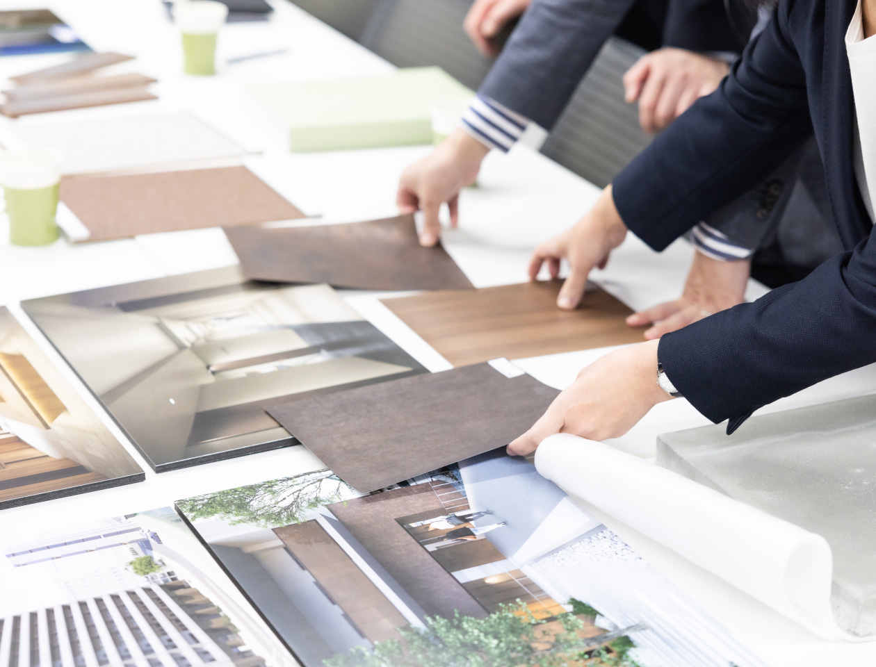 着工後のデザイン監修では、より魅力的な建物となるようデザイン事務所様と内装や仕様について協議・検討し、設計変更に伴うコストやスケジュールの調整も行っています。
